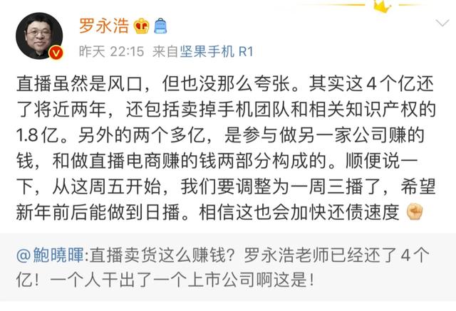 8月底,罗永浩直播由1播/周改为2播/周。9月20日,“交个朋友”官方微博称,本周起将3播/周。罗永浩转发微博表示,大约在新年前后就会实现日播,“相信这会加快还债速度。”